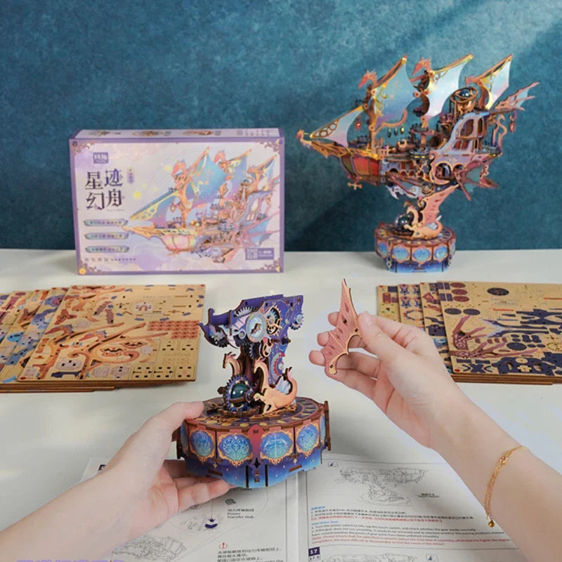 Begib dich auf eine Reise jenseits der Vorstellungskraft mit dem „Magical Galaxy", einem 3D-Holzpuzzle, das gotische Eleganz, himmlische Mysterien und mechanische Wunder vereint. Dieses Modell ist kein gewöhnliches Schiff; es ist ein interaktiver Schrein für Sterndeuter, ein Stück lebendige Fantasie, das du mit deinen eigenen Händen zum Leben erweckst.