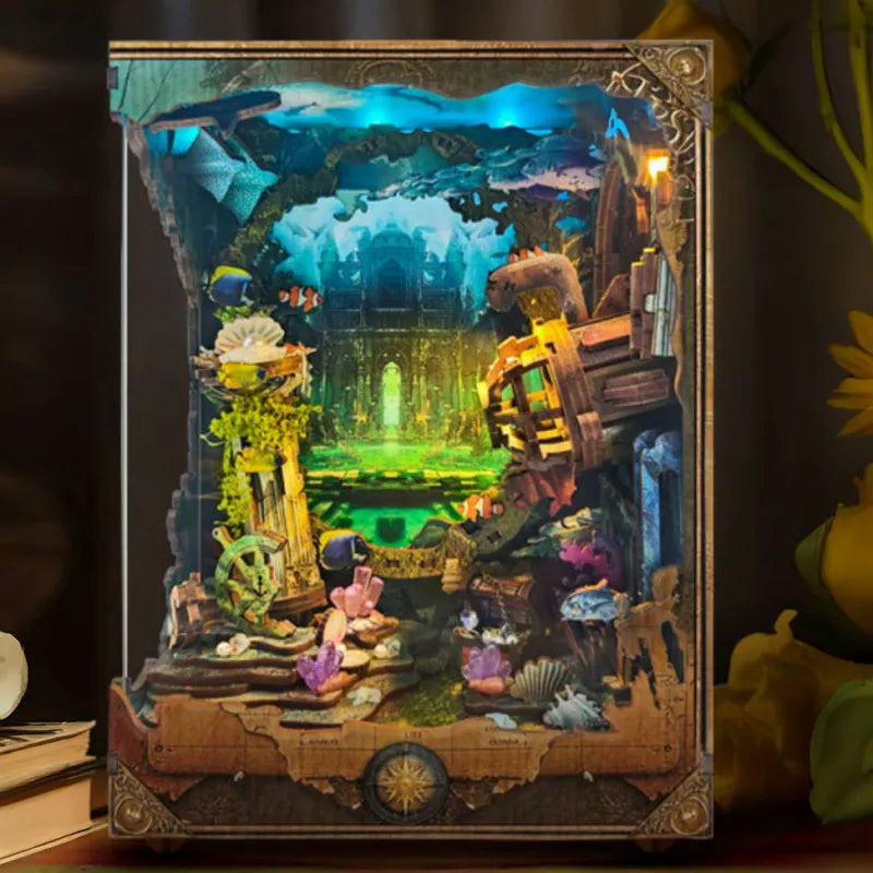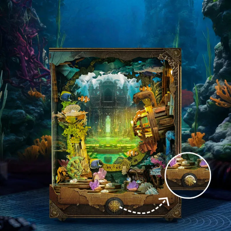 Tauchen Sie ein in das Abenteuer von „Discover Atlantis“, einem Book Nook, das die verlorene Stadt direkt in Ihr Bücherregal bringt. Ein Forschungs-U-Boot beleuchtet mit seinen geheimnisvollen, mehrstufigen LED-Lichtern die versunkenen Ruinen und schafft eine fesselnde Mini-Szene, die die Fantasie anregt und zum Träumen von verborgenen Welten einlädt.