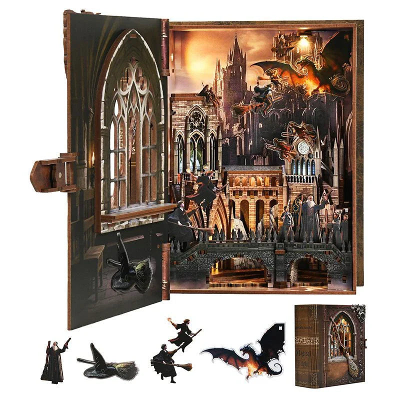 Geöffnet: Ein detailliertes Diorama, das eine Momentaufnahme einer magischen Welt zeigt.