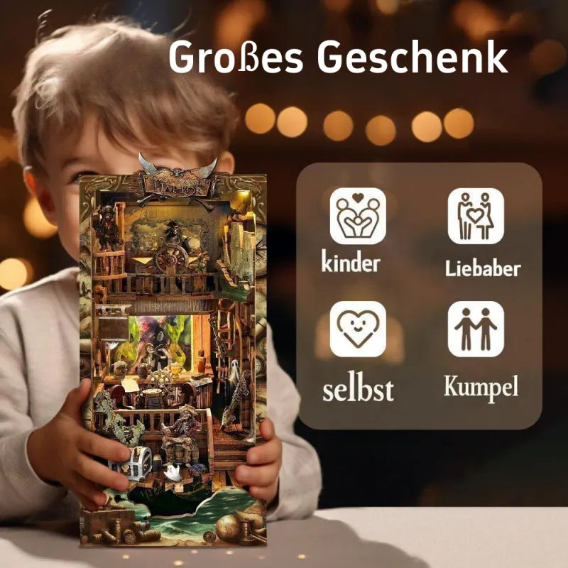 Dieses kunstvolle Book Nook, inspiriert von der „New World Ghost Ship", fängt perfekt die düstere Atmosphäre eines geheimen Geisterschiffs ein. Mit feinster Schnitzerei und durchdachtem Design führt es dich in eine Welt voller ungewisser Abenteuer und Nervenkitzel. Es passt perfekt zu deinem Schreibtisch oder Bücherregal und ist nicht nur ein dekoratives Kunstwerk, sondern auch die ideale Wahl für alle Liebhaber von Fantasie- und Spannungsromanen. Lass dieses Geisterschiff dir grenzenweiten Raum für Fantasie bieten und ein unverzichtbarer Teil deiner Lesereise werden.