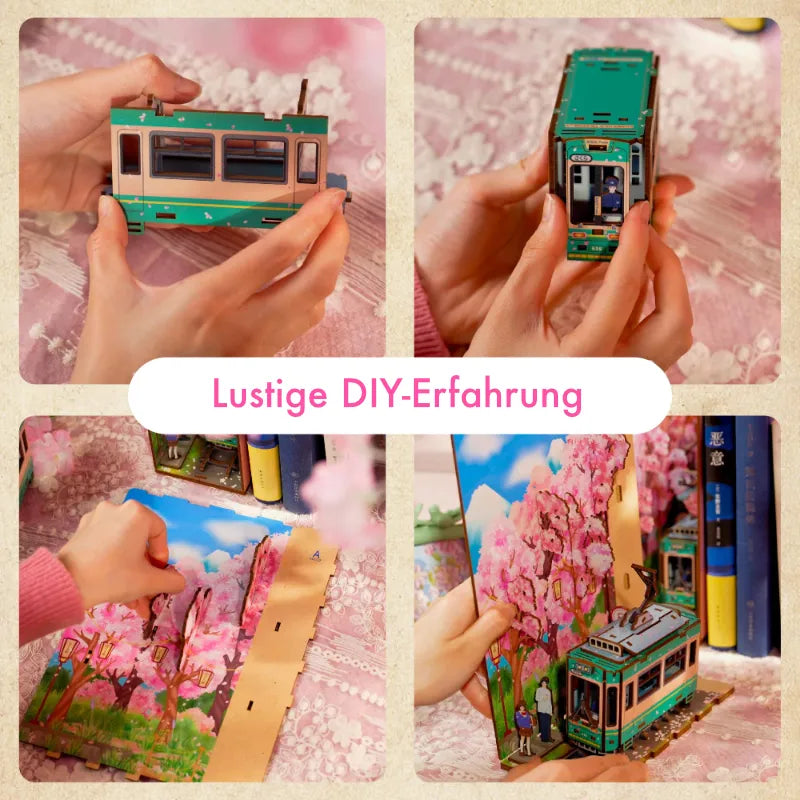 Book Nook - Sakura's Travel baut eine wunderschöne Kirschblütenhütten-Szene auf, die auf der berühmten alten Sightseeing-Straßenbahn basiert, die im Arashiyama-Gebiet von Kyoto, Japan, fährt.