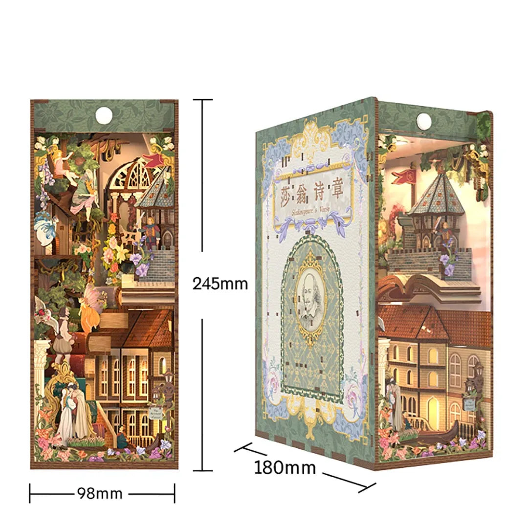 Mit einem Shakespeareanischen Erzähler, der durch das Theaterland wandert, wird dieses Book Nook zu einem exquisiten Schreibtischornament und einem Theater auf Papier. Entdecken Sie die versteckten Überraschungen und die lebendigen Szenen, die dieses Book Nook zu bieten hat, und tauchen Sie ein in die Welt von Shakespeare.