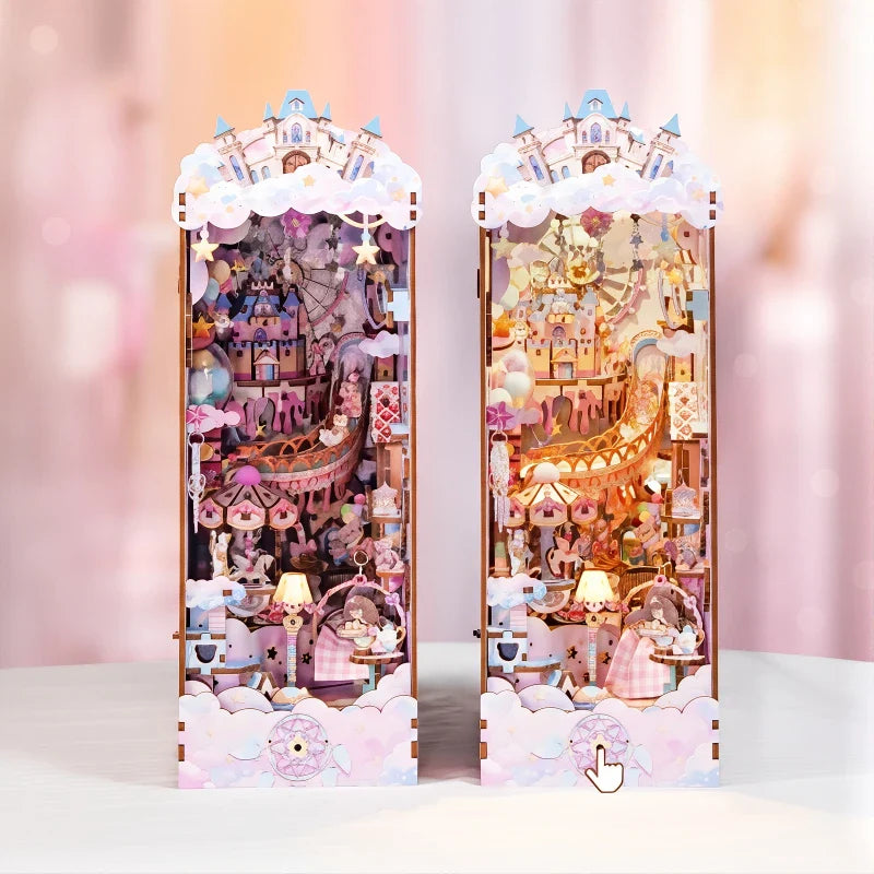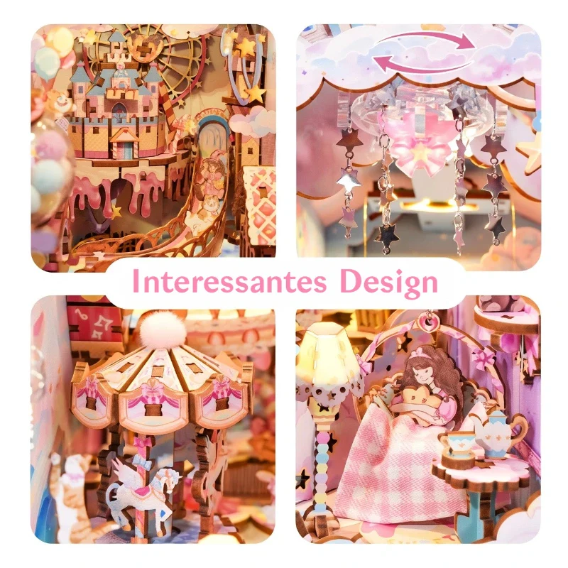 Lassen Sie sich von unserem Book Nook-Sweet Dream in eine Welt entführen, in der Magie und Träume miteinander verschmelzen und romantische Gefühle hervorrufen. Dieses traumhafte Modell fängt den Moment ein, in dem ein Mädchen sanft in einen tiefen Schlaf gleitet und in ein Land voller Süße versinkt. Von schimmernden Sternen bis hin zu einem drehenden Riesenrad – jedes Detail strahlt eine märchenhafte Atmosphäre aus. Das zweistöckige Design mit einer eleganten Wendeltreppe schafft eine zauberhafte Märchenkulisse, die Ihr Bücherregal im Handumdrehen in ein Tor zu süßen Träumen verwandelt.
