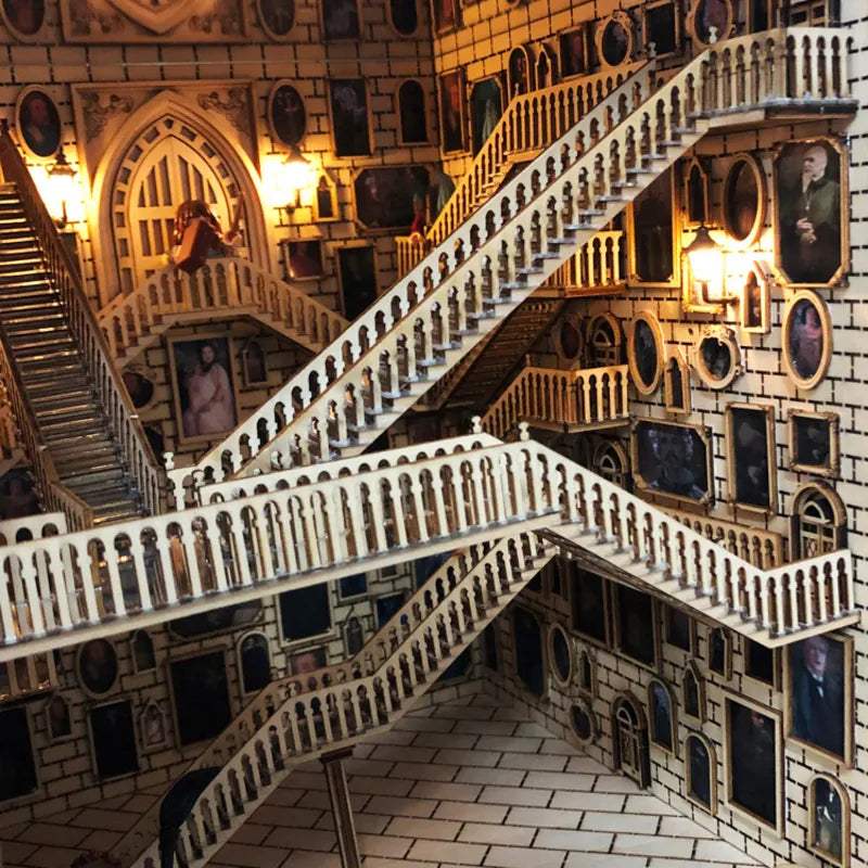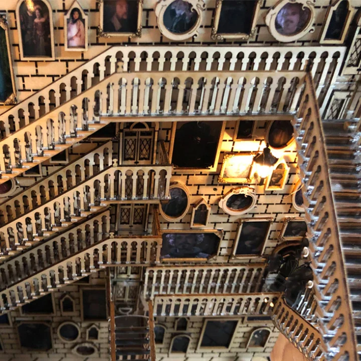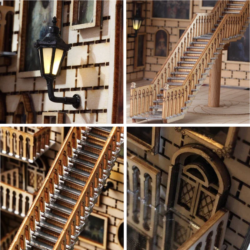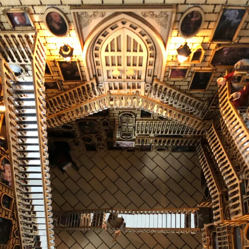 Der „Magic School“ Book Nook lässt Sie in die bezaubernde Welt Ihres Lieblingszauberers eintauchen und bietet eine anpassbare Möglichkeit, das magische Universum von Harry Potter auf Ihrem Bücherregal zum Leben zu erwecken. Inspiriert vom Charme und der Größe von Hogwarts verfügt dieses aufwendig gestaltete Set über ein faszinierendes Element – ein komplexes Treppensystem mit einem Kontrollknopf, mit dem Sie die Treppen drehen und Ihrem Display einen Hauch von Zauberei verleihen können. Die dynamischen Fotorahmen erwecken die Szene zum Leben, da sich die Bilder darin bewegen und verschieben, ähnlich den magischen Porträts in den Hallen der magischen Schule.