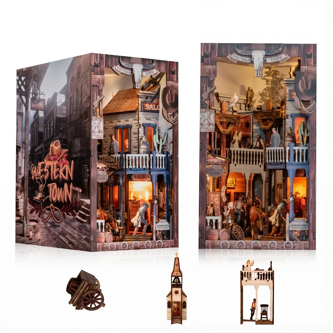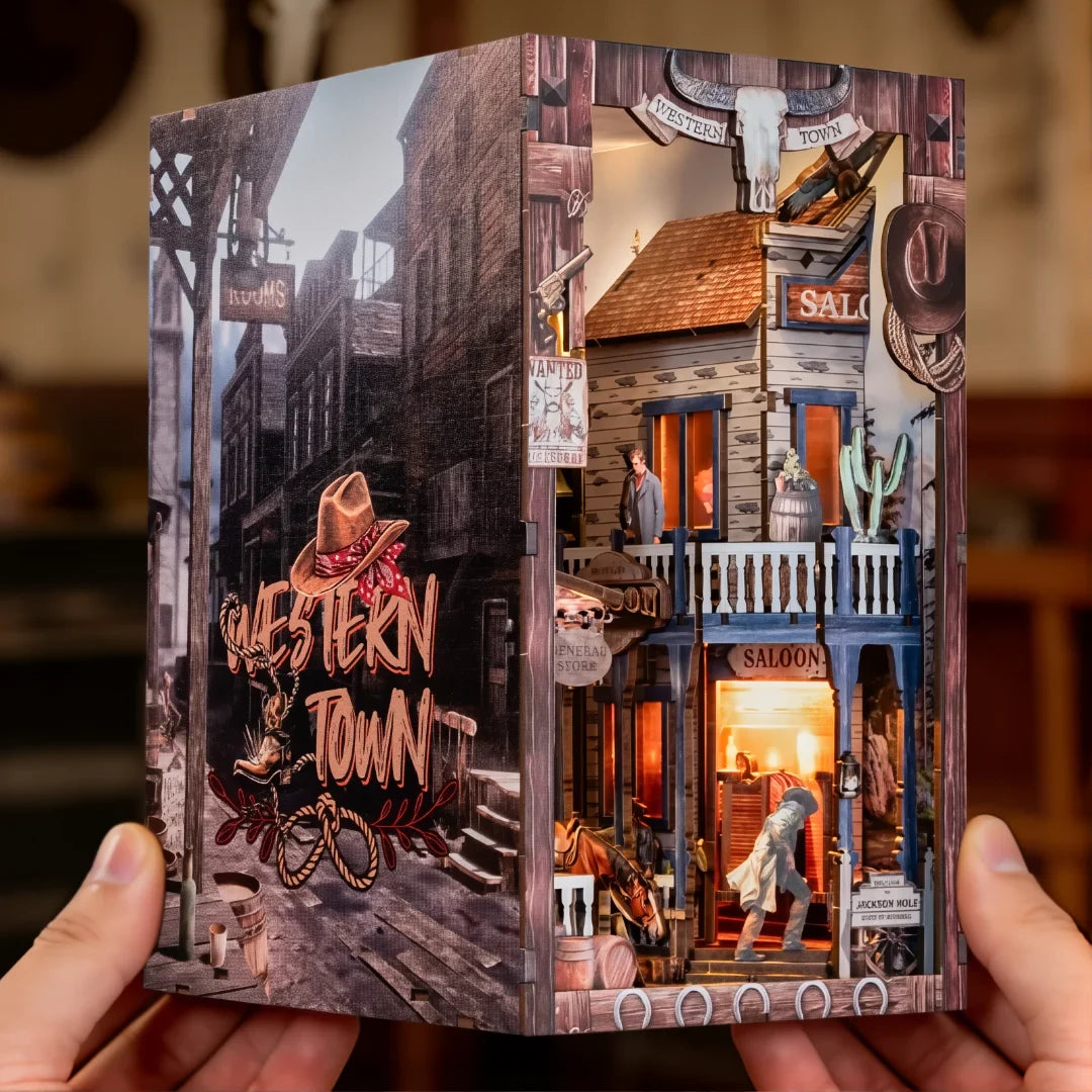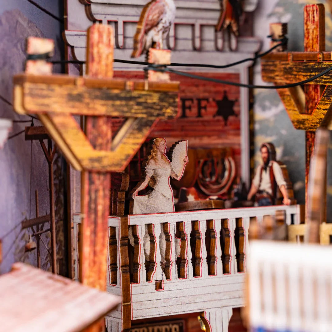 Das DIY Holz Book Nook "Western Town" entführt Sie direkt in die goldene Ära der Cowboys und Abenteurer. Wenn die Sonne den Horizont rot färbt, erwacht diese kleine Stadt zum Leben. Dieses Modell ist eine detailgetreue Momentaufnahme voller Dynamik und Geschichte.