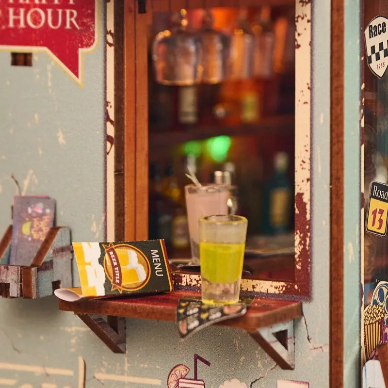 Dieses tropisch inspirierte Miniaturhaus entführt Sie in eine lebendige Strandbar, wo warme LED-Beleuchtung, liebevolle Details und sommerliche Farben eine Atmosphäre purer Lebensfreude schaffen. Jedes Element – vom Spielautomaten bis zur Cocktailflasche – wurde mit Sorgfalt gestaltet, um die entspannte Stimmung eines Urlaubs am Meer einzufangen.